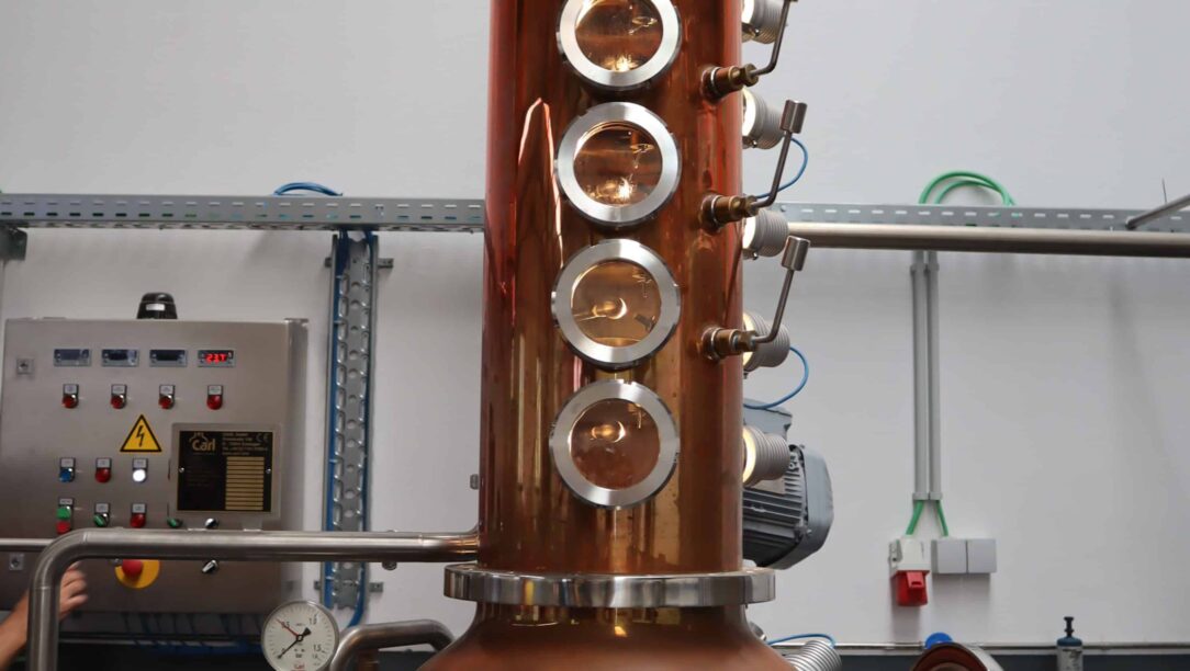 Tento krásný kotlík, který by si každý přál mít doma v obýváku, nese nad sebou část kolony se čtyřmi patry, které se dají nastavit dle potřeby. Následuje deflegmátor a kondenzátor. Palírna však již čeká na další destilační aparát, který by měl také pocházet z Německa, jako stávající zařízení. Měla by se tak rozšířit kapacita palírny.